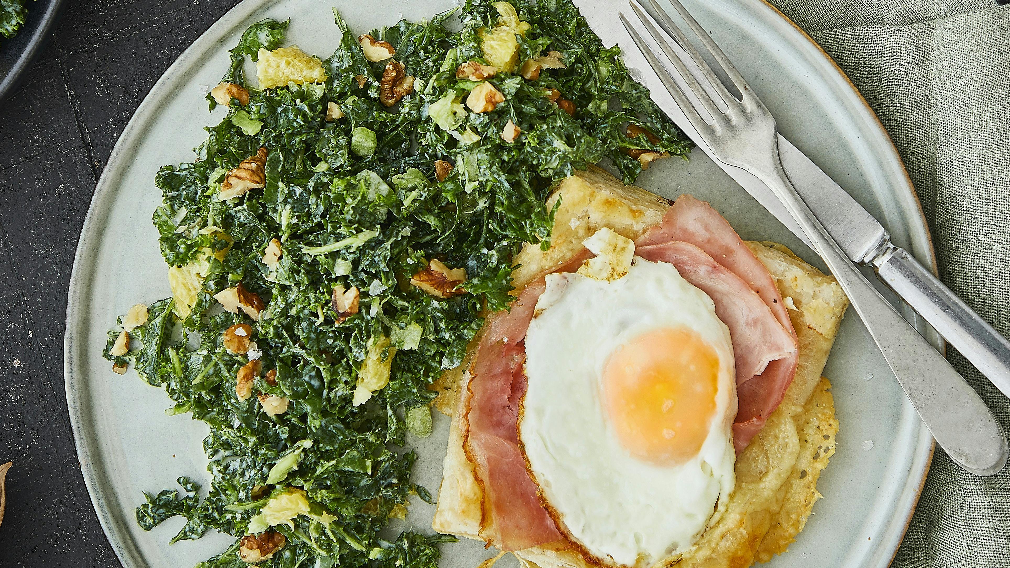 Butterdej, skinke og æg kombineres med en forfriskende grønkålssalat for en perfekt balance af smag og tekstur.