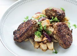 Skønne frikadeller med champignoner serveret med honningbagt selleri og grovflute. Opskrifrten på disse frikadeller er fra Slankeklubben.