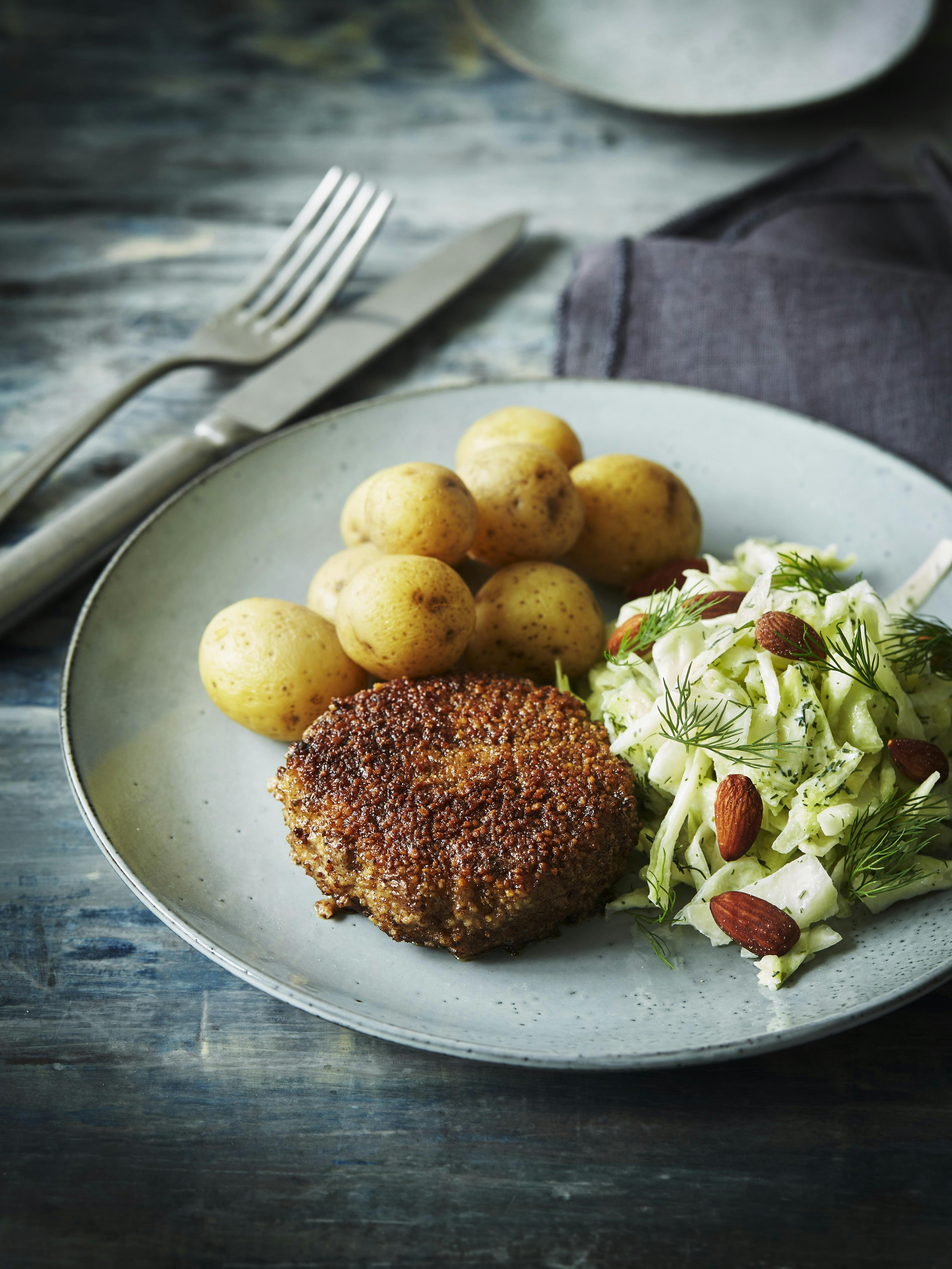 Krebinetter med kartofler og spidskålssalat - en dejlig klassiker, som vi alle er helt vilde med!