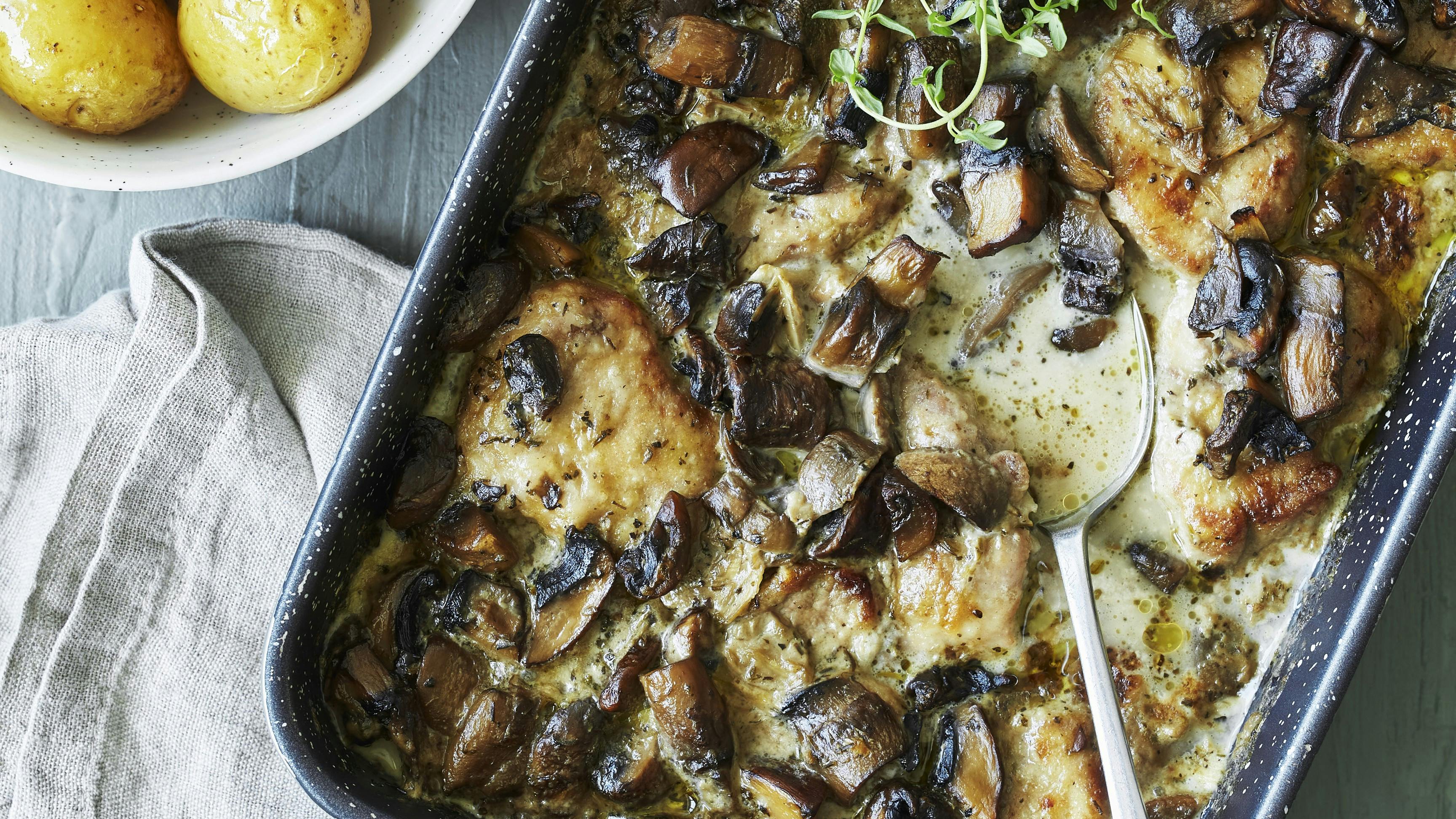 Mørbradbøffer i cremet sovs med svampe og smørbagte kartofler
