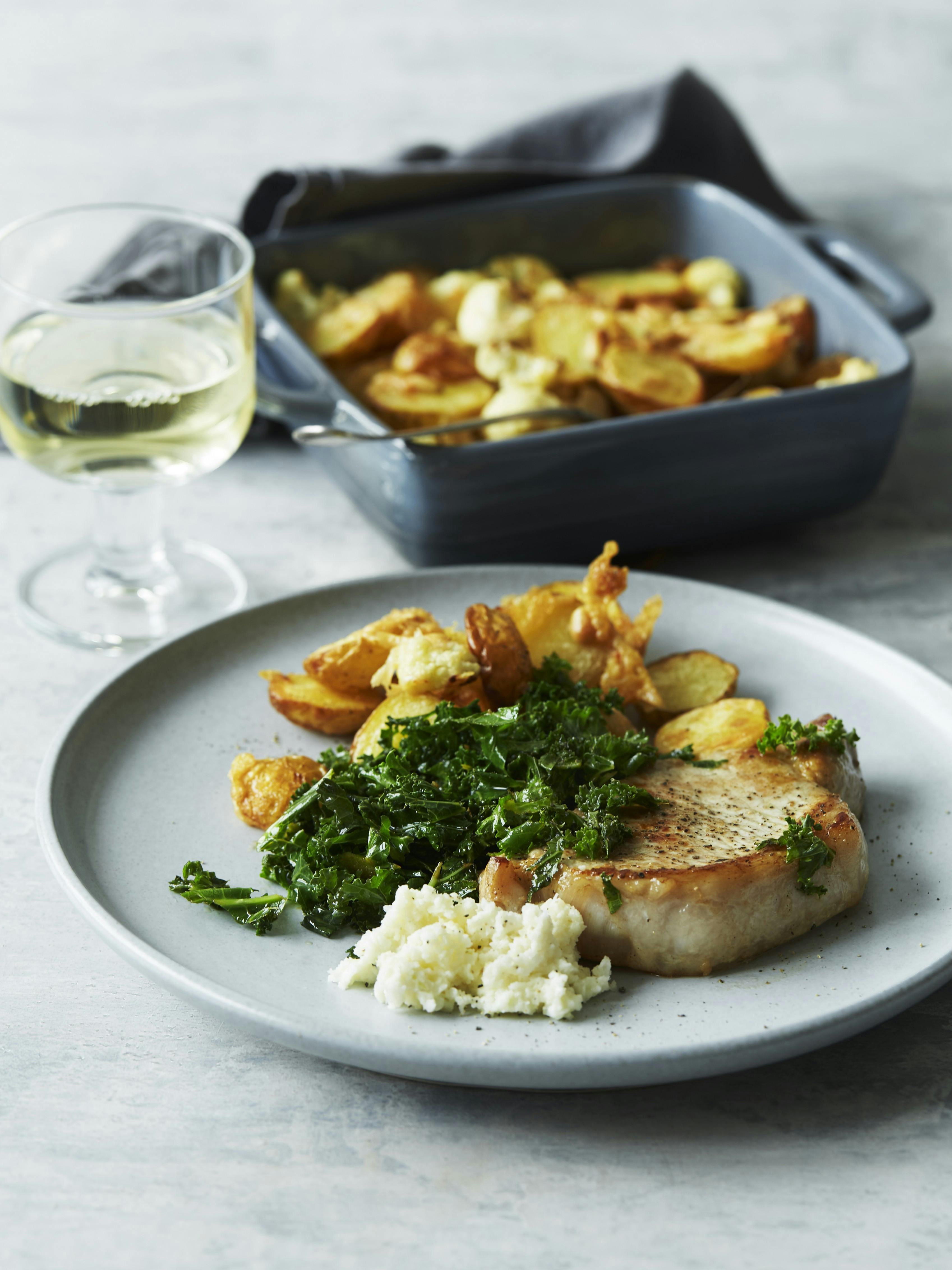 Forkæl familien med velsmagende svinekoteletter med bagt blomkål og små kartofler.