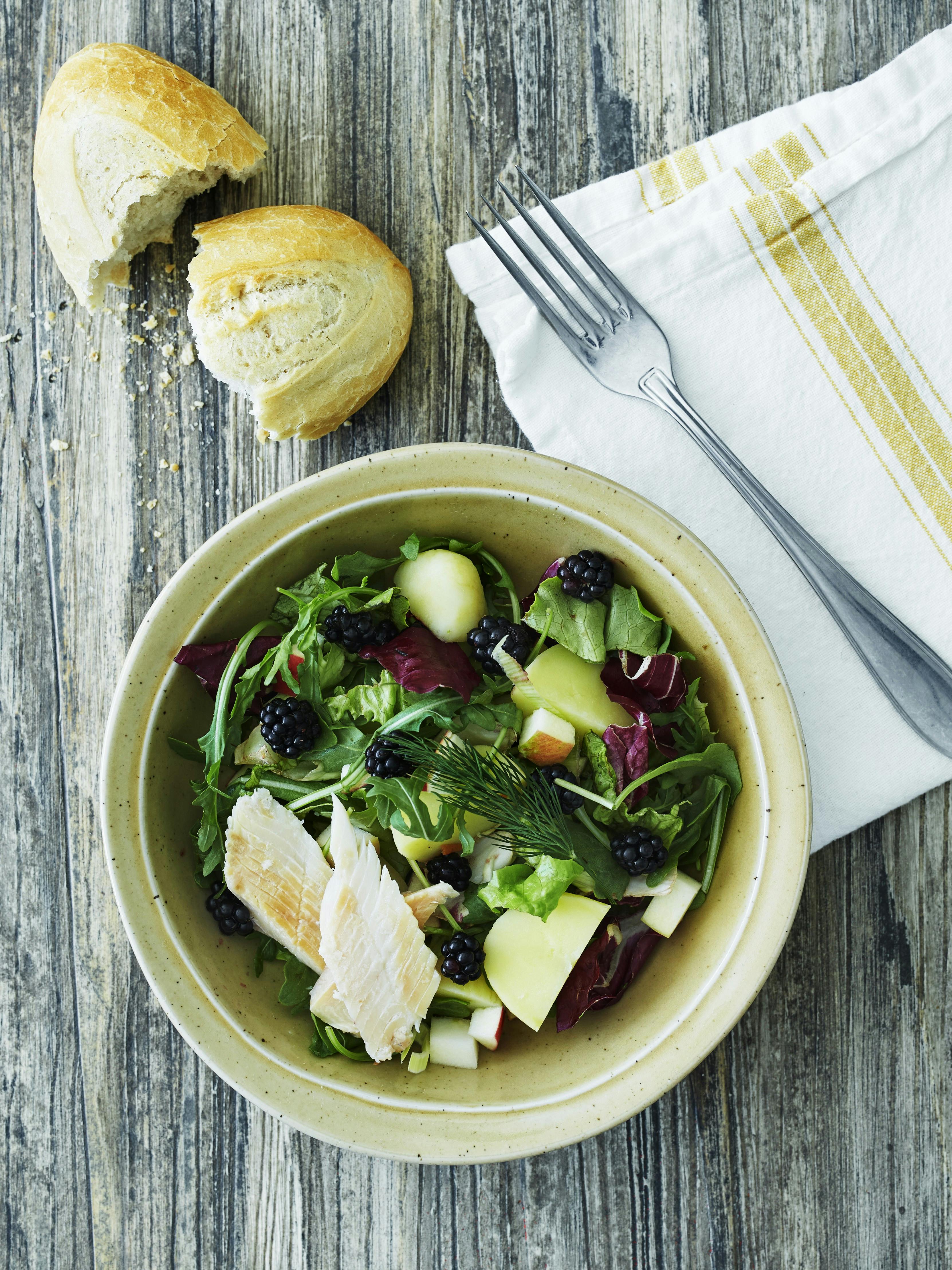 Salat med brombær, æbler og røget ørred: