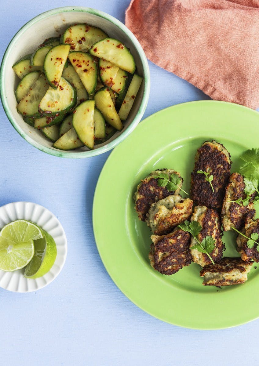 De krydrede fiskedeller med spicy agurkesalat er en nem ret med et asiatisk twist.