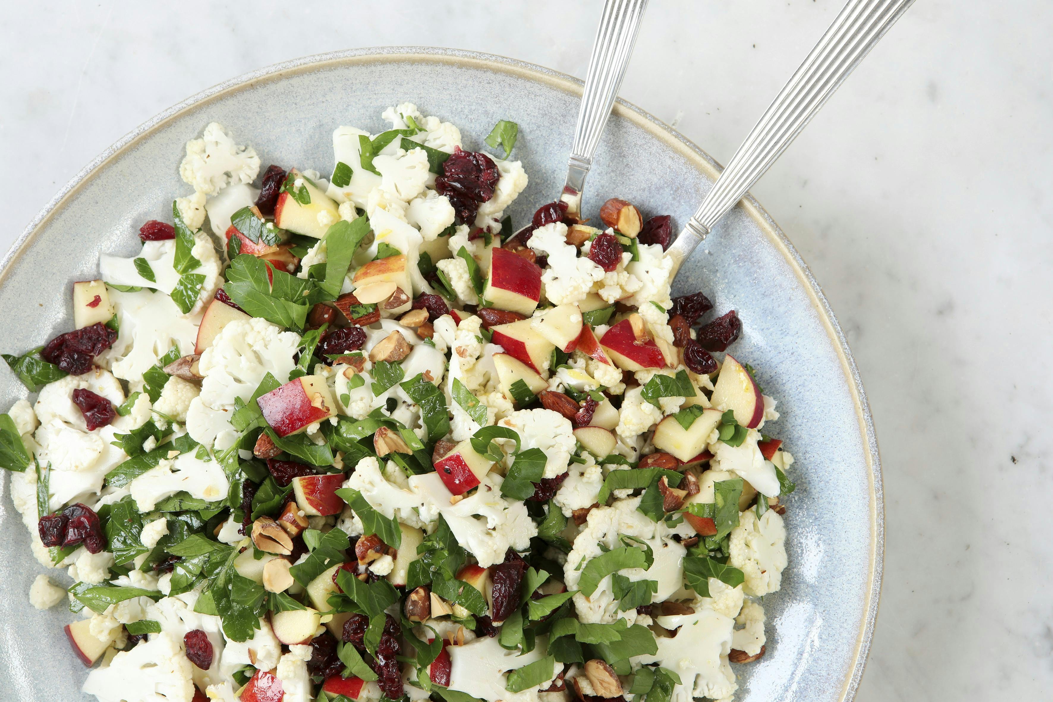 Blomkålssalaten er med æbler og tranebær tilsat en dressing med citron og rørsukker. Opskriften er udviklet af Ubberup Højskole.