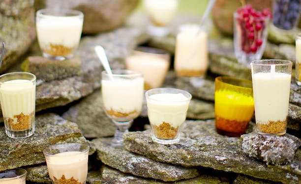 Indimellem kan man godt tilfredsstille sin søde tand med bare nogle få mundfulde af noget rigtig lækkert. Derfor har Jamie Oliver valgt at servere denne skønne dessert i små portionsskåle. Til cheesecake-bunden er brugt digestive-kiks, men ingefærkiks eller andre søde kiks går også fint.
