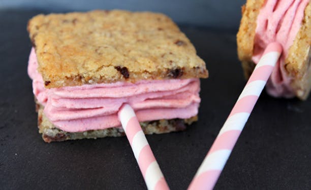 Cremet rabarber-hindbæris mellem to chewy cookies med masser af chokolade og ristede mandler. Behøver vi sige mere...