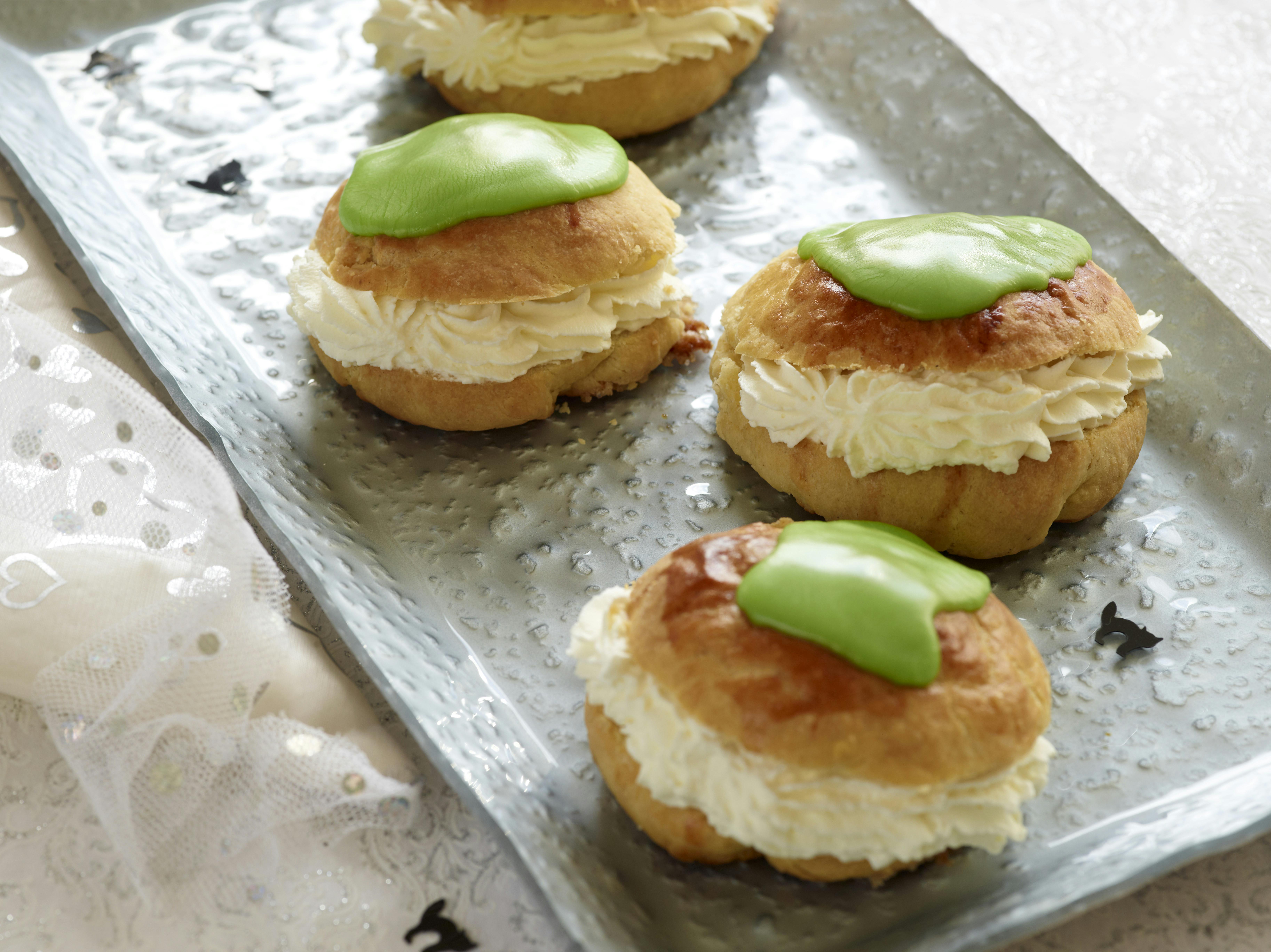 Festlige fastelavnsboller med grøn glasur, flødeskum og remonce.