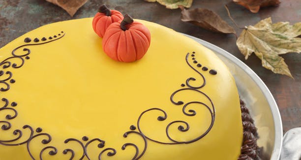 Flot kage med græskar og mørk chokolade, pyntet med appelsinglasur - kageopskriften er fra Lars Juul, chefkonditor hos Conditori La Glace