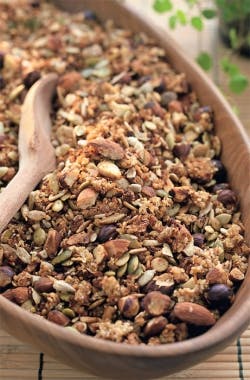 Opskrift på sund og hjemmelavet mysli med boghvede, hørfrø, blandede nødder og honning.
