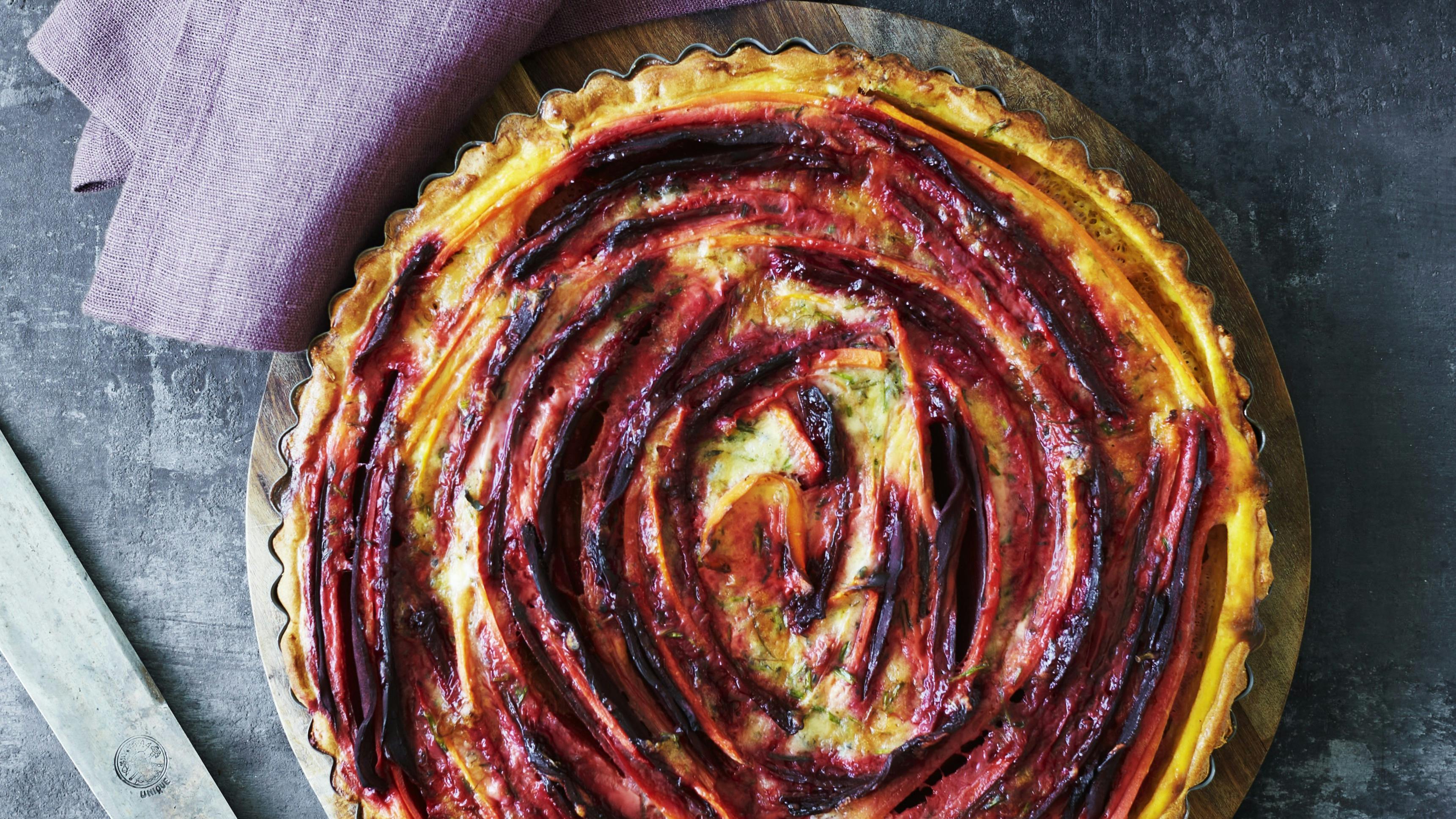 Smuk madtærte med gulerod og rødbeder på en hjemmelavet fuldkornsbund
