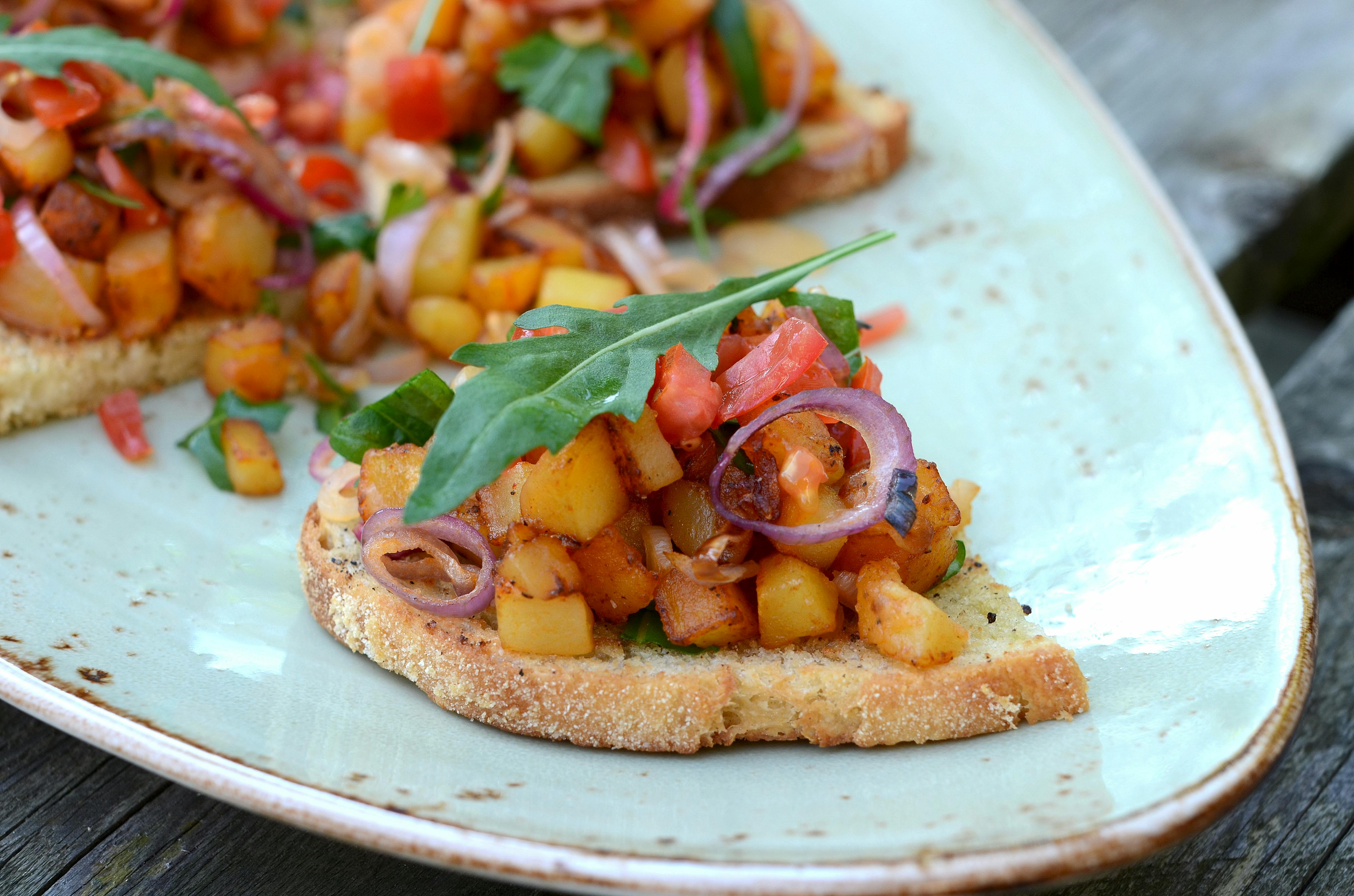 Lækker variation af den kendte forret med tomater og hvidløg på ristet brød. Her får du en udgave, hvor tomaterne er blandet med kartofler og løg, der er smagt til med røget paprika.