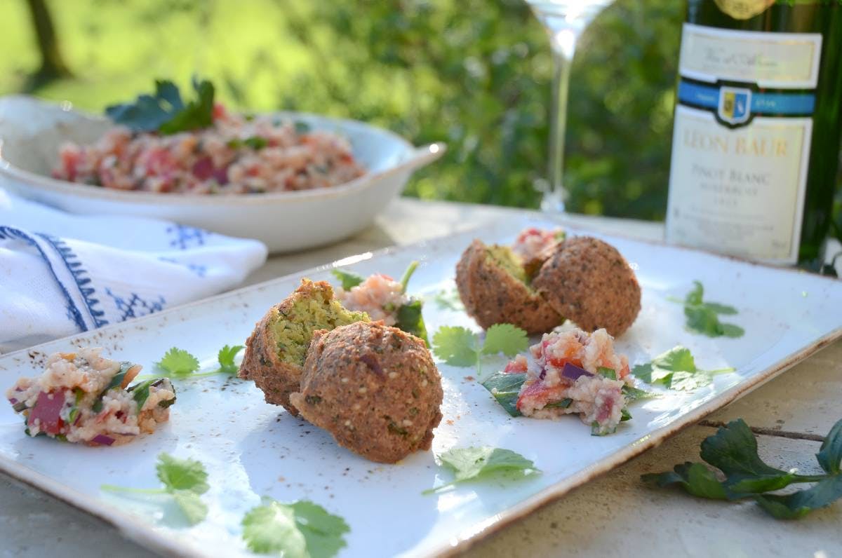 Falaflerne her er tilberedt af kikærter krydret med sesamfrø, spidskommen, koriander, hvidløg og persille. Krydderierne giver dem en fyldig smag, og kikærternes indhold af protein sørger for, at kød bliver helt overflødigt. En fin ret - også for vegetarer.