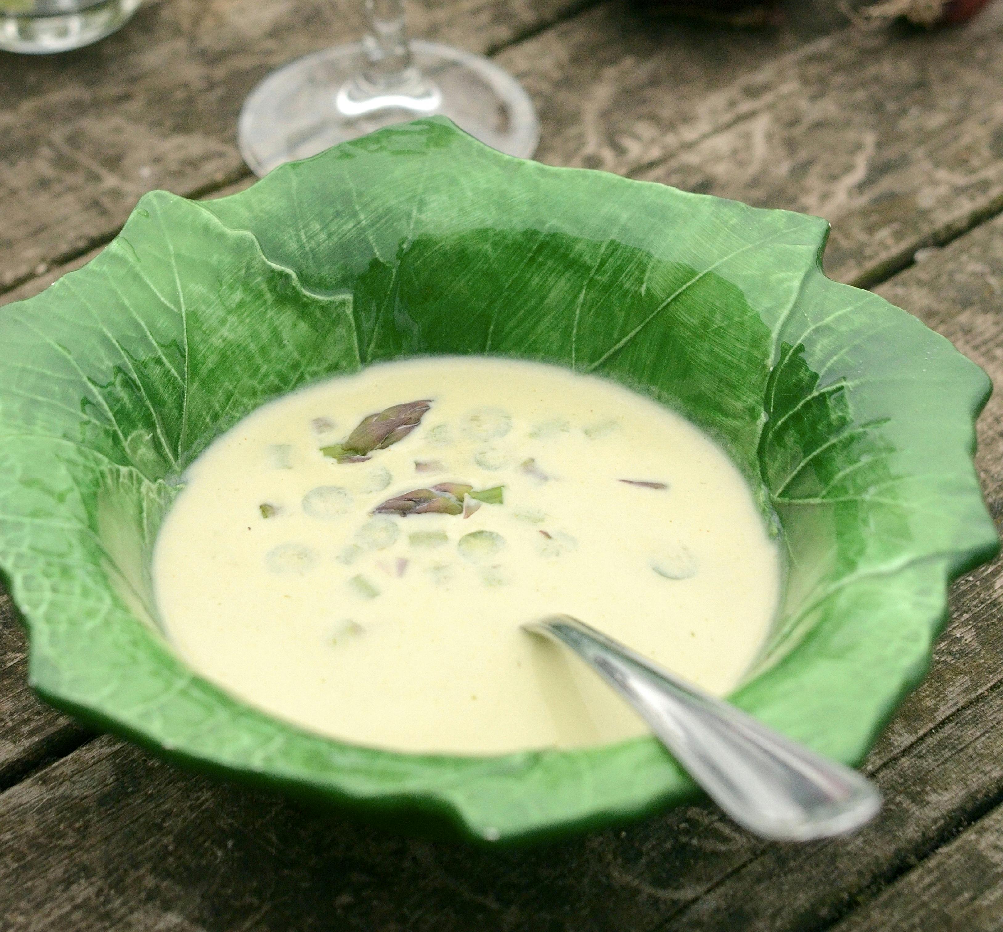 Aspargessuppen er et sommerhit. Aspargesene bages i ovnen, inden de koges. Det giver en særlig rund og delikat smag.