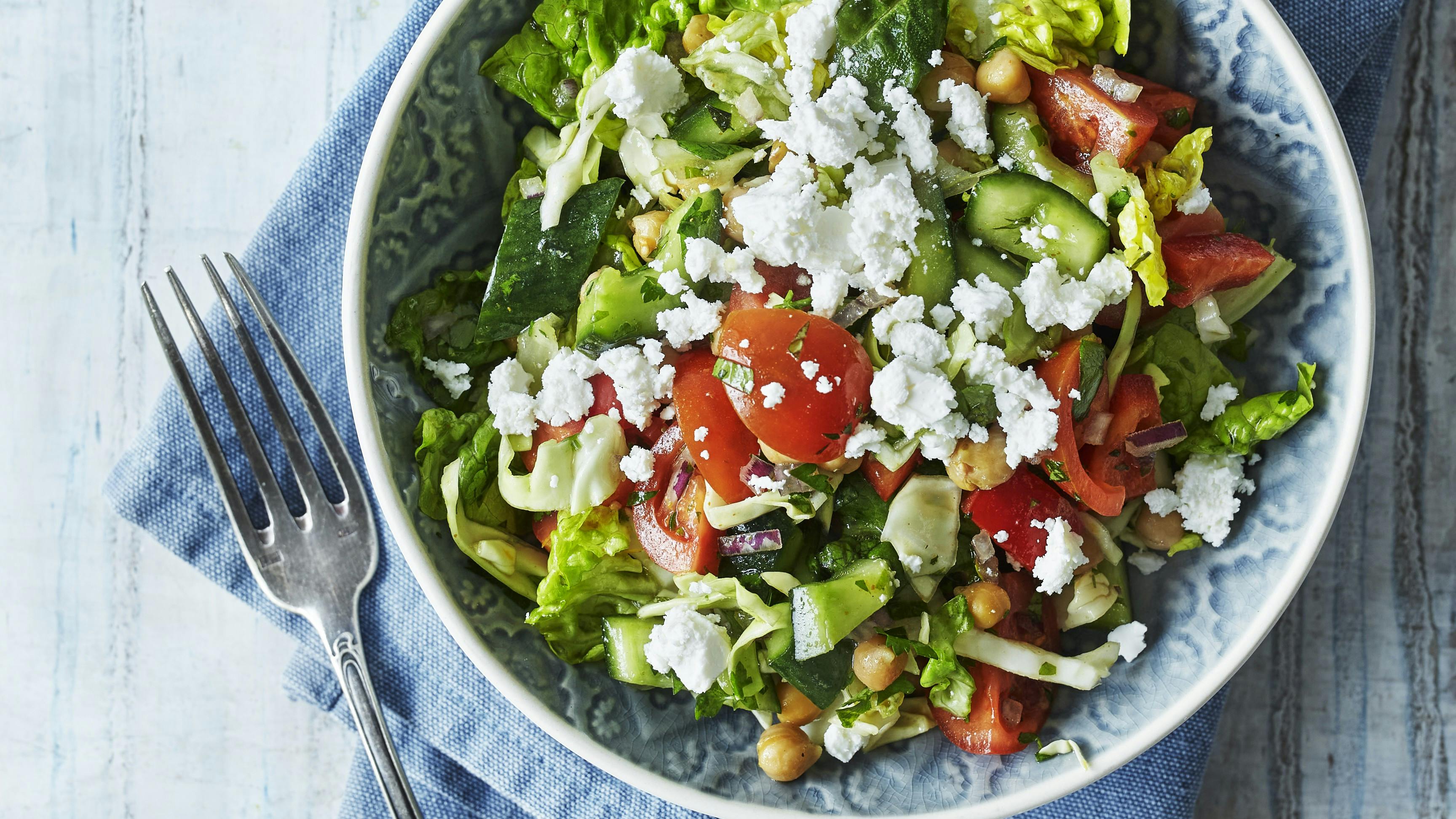 Lækker kikærtesalat med friske grøntsager, feta og en skøn dressing. Salaten tager ingen tid at lave, og du kan servere den til et stykke grillet kød, eller som den er.