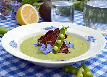 Nyd denne dejlige ærtesuppe kold på en varm sommerdag eller varm, når det er køligt i vejret. Særligt lækker bliver den med et drys af noget salt på toppen, fx saltmandler, ristede pinjekerner, baconstykker eller som her rugbrødschips.