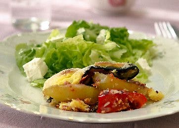Smagsfuld grøntsags-moussaka med kraftig tomat-løgkompot