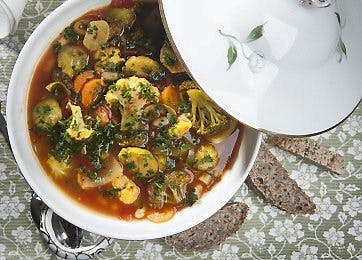 Krydret og velsmagende urtesuppe med hvide bønner, blomkål, broccoli og rosenkål. En dejlig vinterret, der både varmer og mætter!