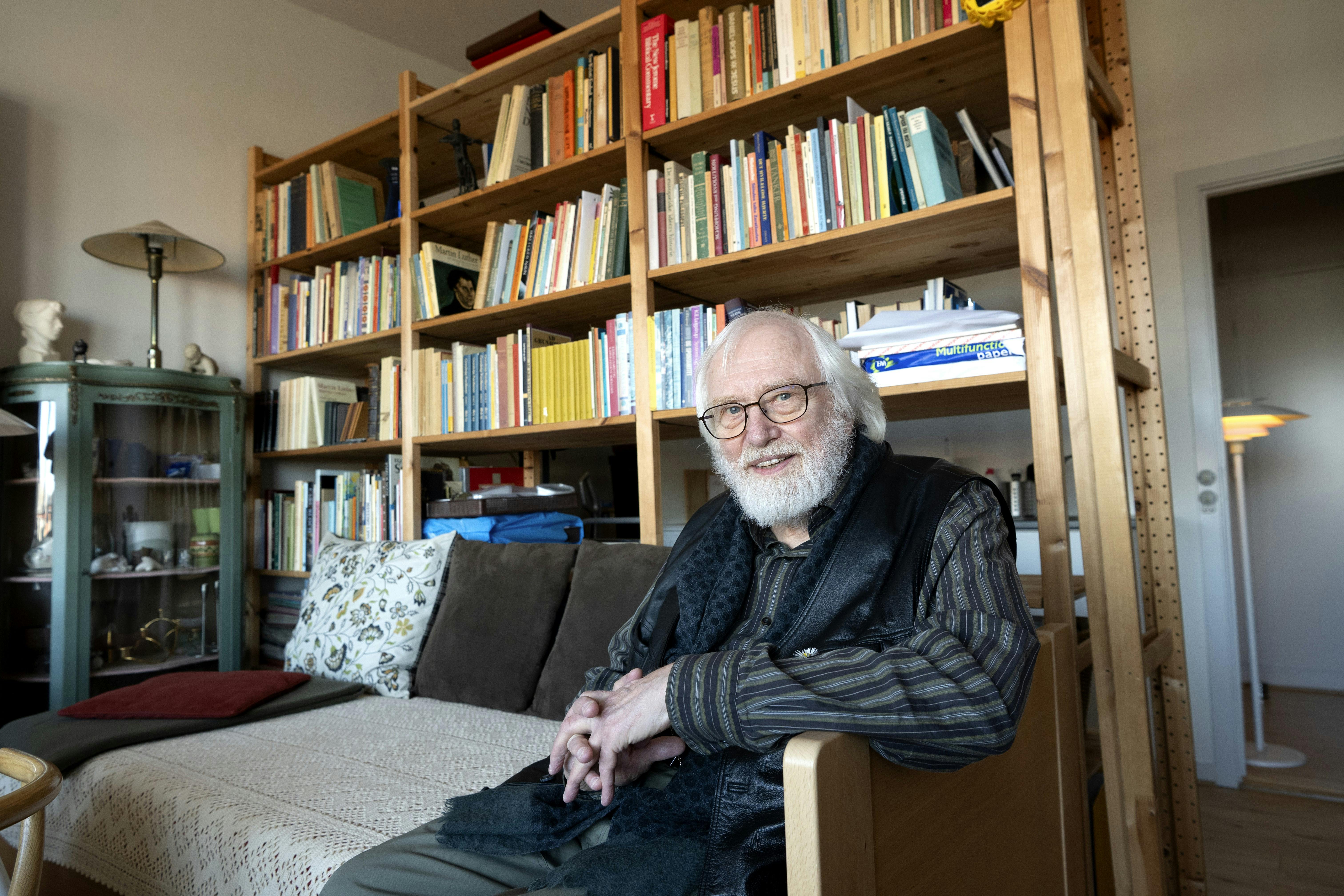 Bjørn der sidder i sin sofa. Der er en kæmpe bogreol i baggrunden.