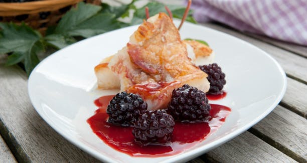 Brombærsaucen er god til både kød, fisk og fjerkræ. Her er den serveret til skindstegt rødfisk.